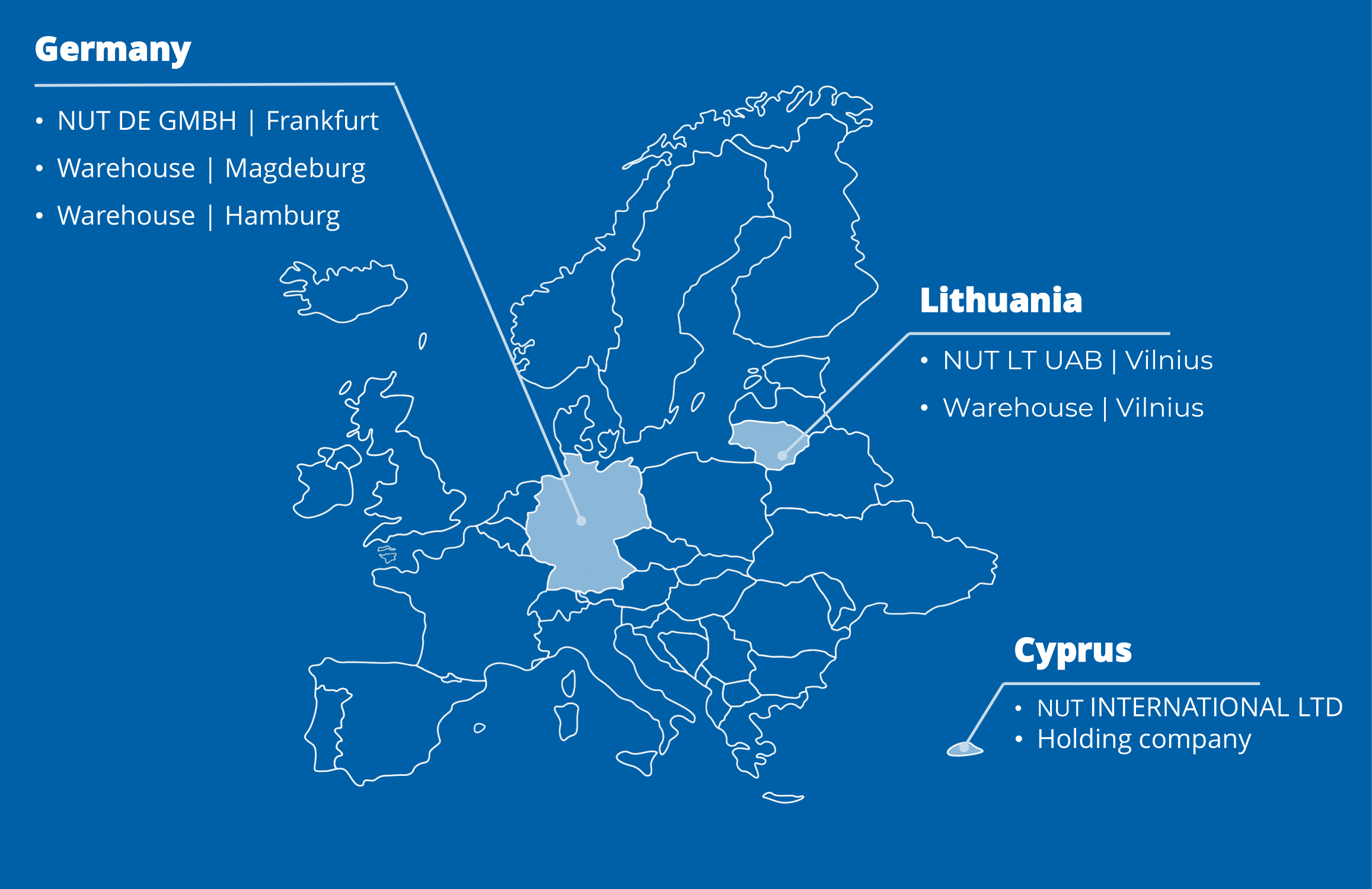 NUT International operates globally with key locations in Limassol, Frankfurt, and Vilnius.